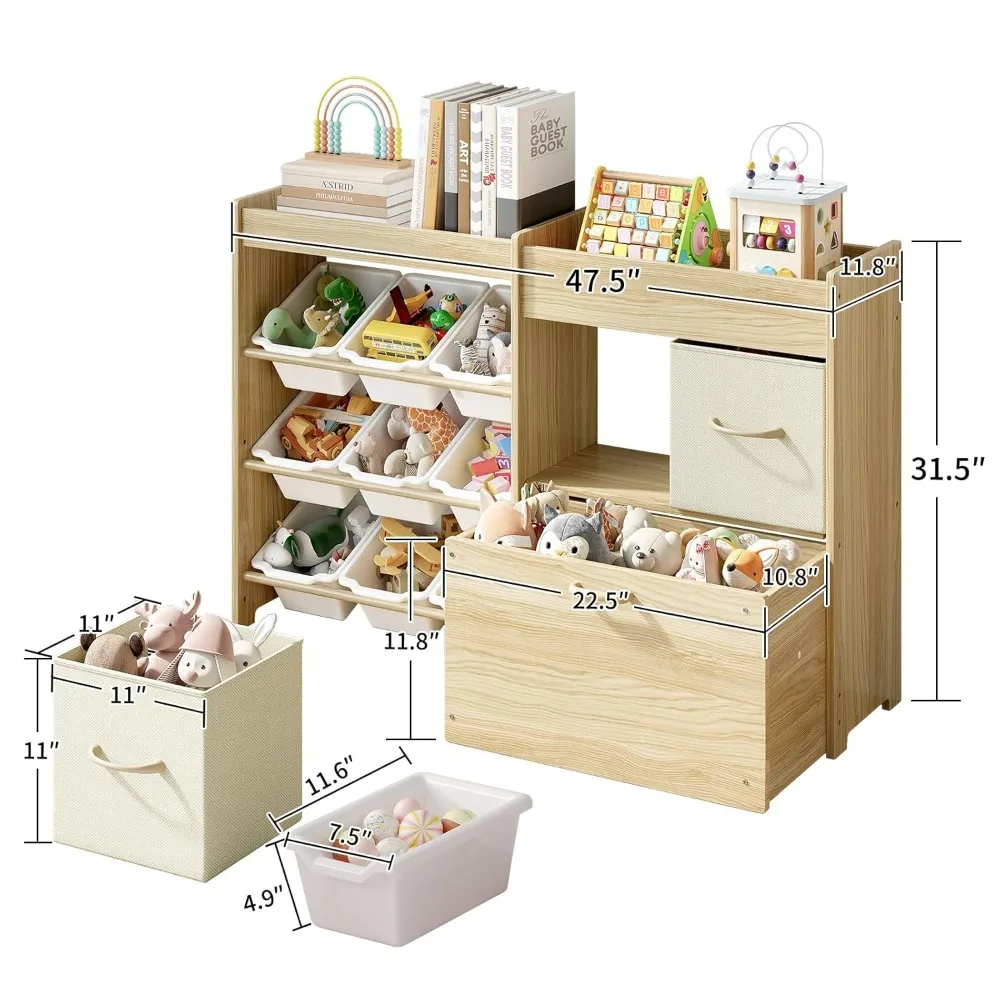 This Storage Shelf is a stylish and practical wooden organizer designed to keep toys, books, and essentials neatly stored. Featuring 9 storage bins, 2 drawers, and a movable toy chest, it offers plenty of space for organizing children’s belongings in bedrooms, playrooms, and nurseries.